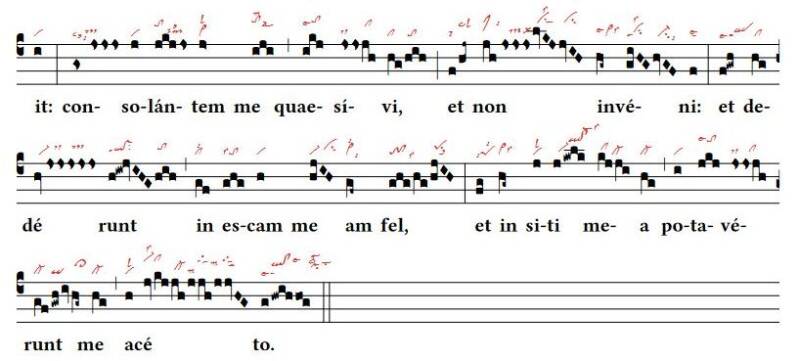 De neumen zijn afgebeeld in bijgaande partituur of manuscript